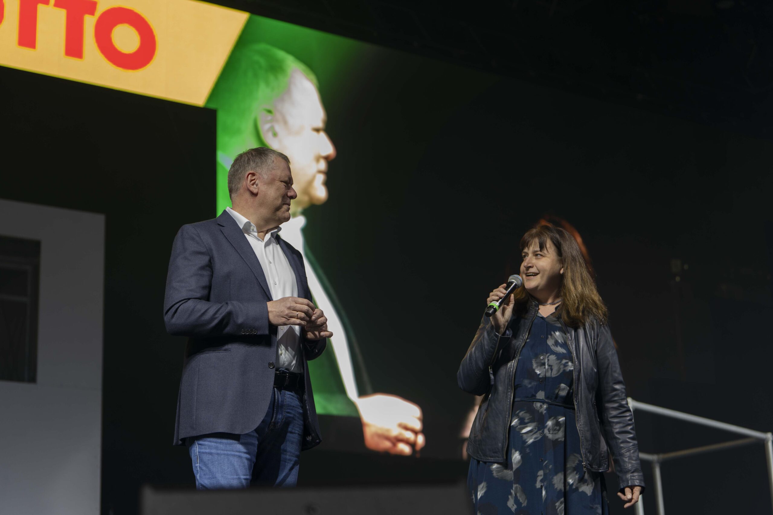 WestLotto Geschäftsführer Andreas Kötter und LAGFA-Vorsitzende Stephanie Krause begrüßen die Ehrenamtlichen in der Grugahalle. Foto: WestLotto