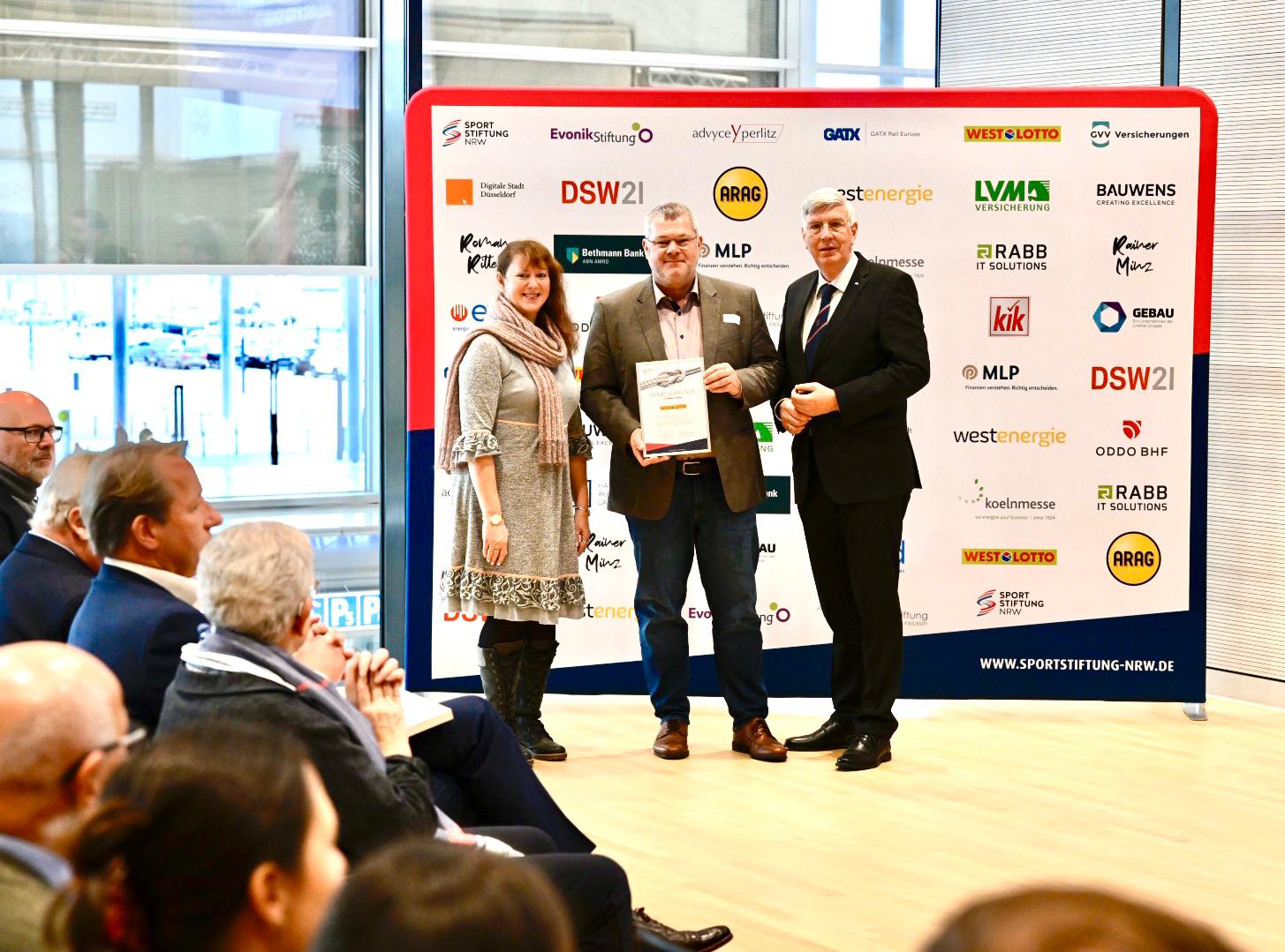 Unternehmenssprecher Axel Weber nimmt für WestLotto die Urkunde als Förderpartner des NRW-Sportstiftungs-Stipendiums von Staatssekretärin Andrea Milz und dem Sportstiftungs-Vorstandsvorsitzenden Ingo Wolf entgegen.