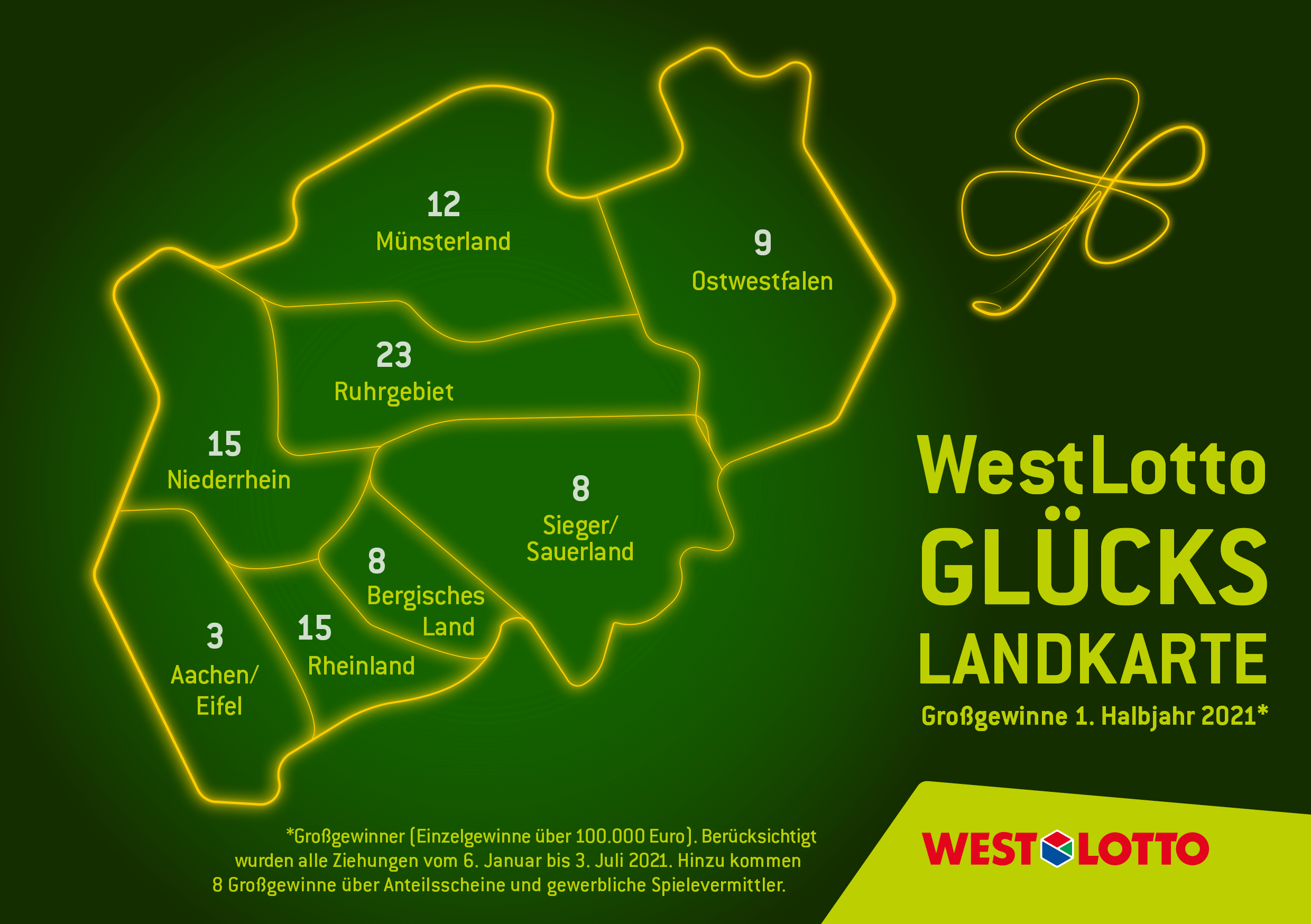 In der jährlichen Bilanz auf Kreisebene und der kreisfreien Städte landet der Kreis Recklinghausen mit 13 Gewinnen ab 100.000 Euro auf dem ersten Platz. Auf Platz zwei folgt der Raum Essen (10 Großgewinner). Den dritten Rang erzielte der Raum Dortmund mit neun Großgewinnen.