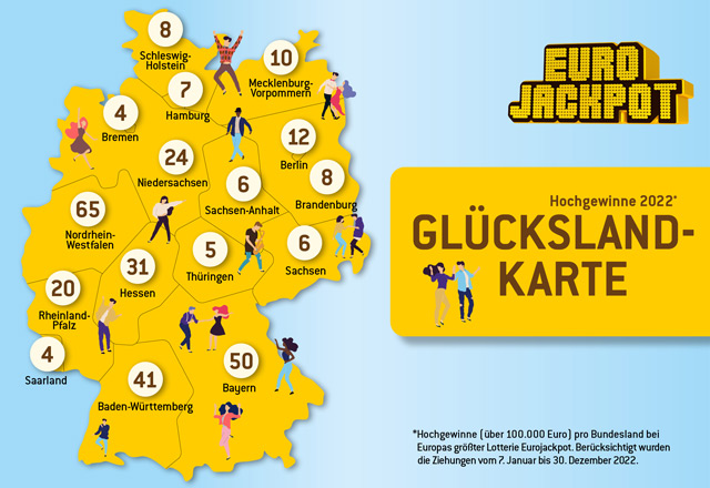 Schaut man sich die deutsche Gewinnerbilanz im Detail an, so ist Nordrhein-Westfalen wie schon im Vorjahr das Land mit den meisten Gewinnern. 65 Spielteilnehmer freuten sich über Millionentreffer oder Hochgewinne im sechsstelligen Bereich. Auf den Plätzen 2 und 3 folgen Bayern mit 50 und Baden-Württemberg mit 41 Gewinnen.