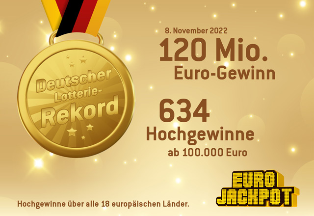 Aber auch in Deutschland lebt inzwischen ein 120-facher Eurojackpot-Millionär, den die Lotterie 2022 verkünden konnte und der jetzt den Rekordtitel innehat. Eine Person aus Berlin räumte am 8. November mit einem Spielschein aus einer Annahmestelle groß ab.