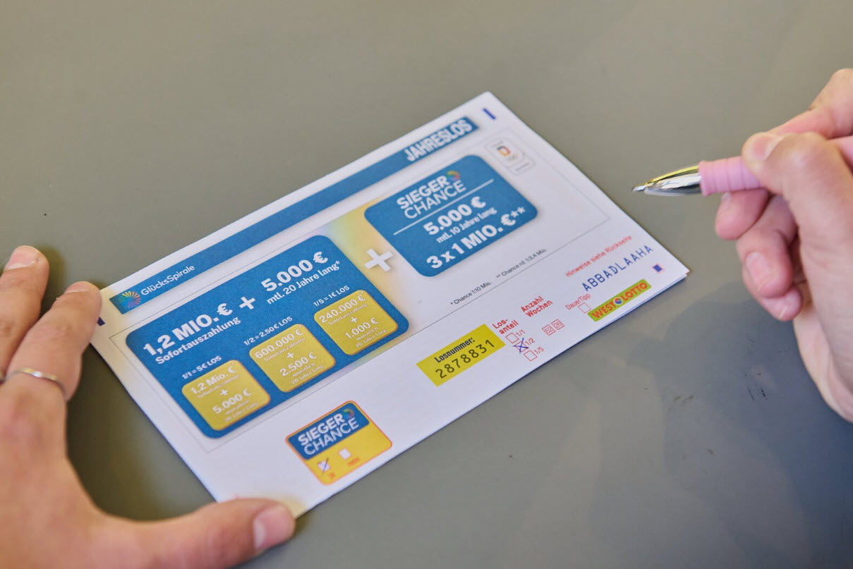 Die Chance auf den Spitzengewinn in Höhe von 1,2 Millionen Euro sofort plus zusätzlich 5.000 Euro monatlich, 20 Jahre lang liegt bei 1:10 Millionen. Jede Woche gibt es die Chance auf diesen Höchstgewinn der GlücksSpirale, dem ein Gesamtbetrag von 2,4 Millionen Euro zugrunde liegt.