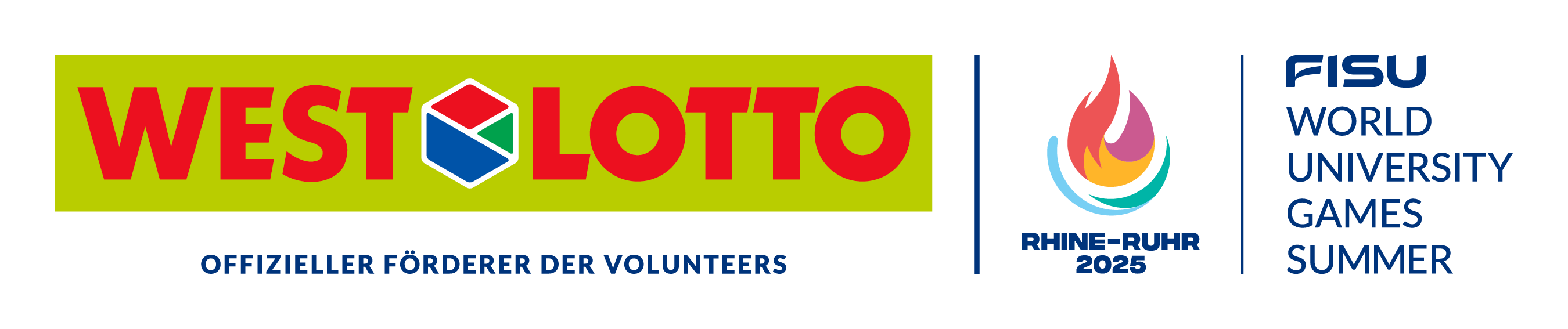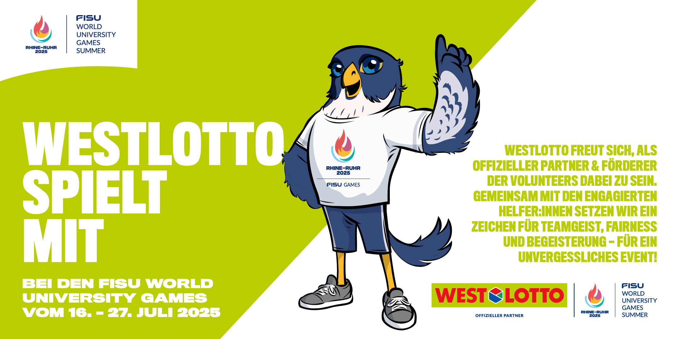 WestLotto ist als Sponsor während des gesamten Events vom 16. bis zum 27. Juli unter anderem mit Mitmachaktionen für die Fans vor Ort präsent. Zudem wird das Unternehmen mit seinem Logo auf den Volunteer-Uniformen vertreten sein und so sein besonderes Engagement für die rund 12.000 Freiwilligen zeigen, die in den sechs Host Cities von Rhine-Ruhr 2025 aktiv sein werden. Die Volunteers sind in allen Bereichen des Events tätig und unterstützen beispielsweise die Zuschauerinnen und Zuschauer bei der Anreise sowie bei ihren Besuchen in den Sportstätten. Nur mit Unterstützung der Volunteers ist es möglich, dass die FISU World University Games in diesem Sommer zu einem großen Erfolg werden.
