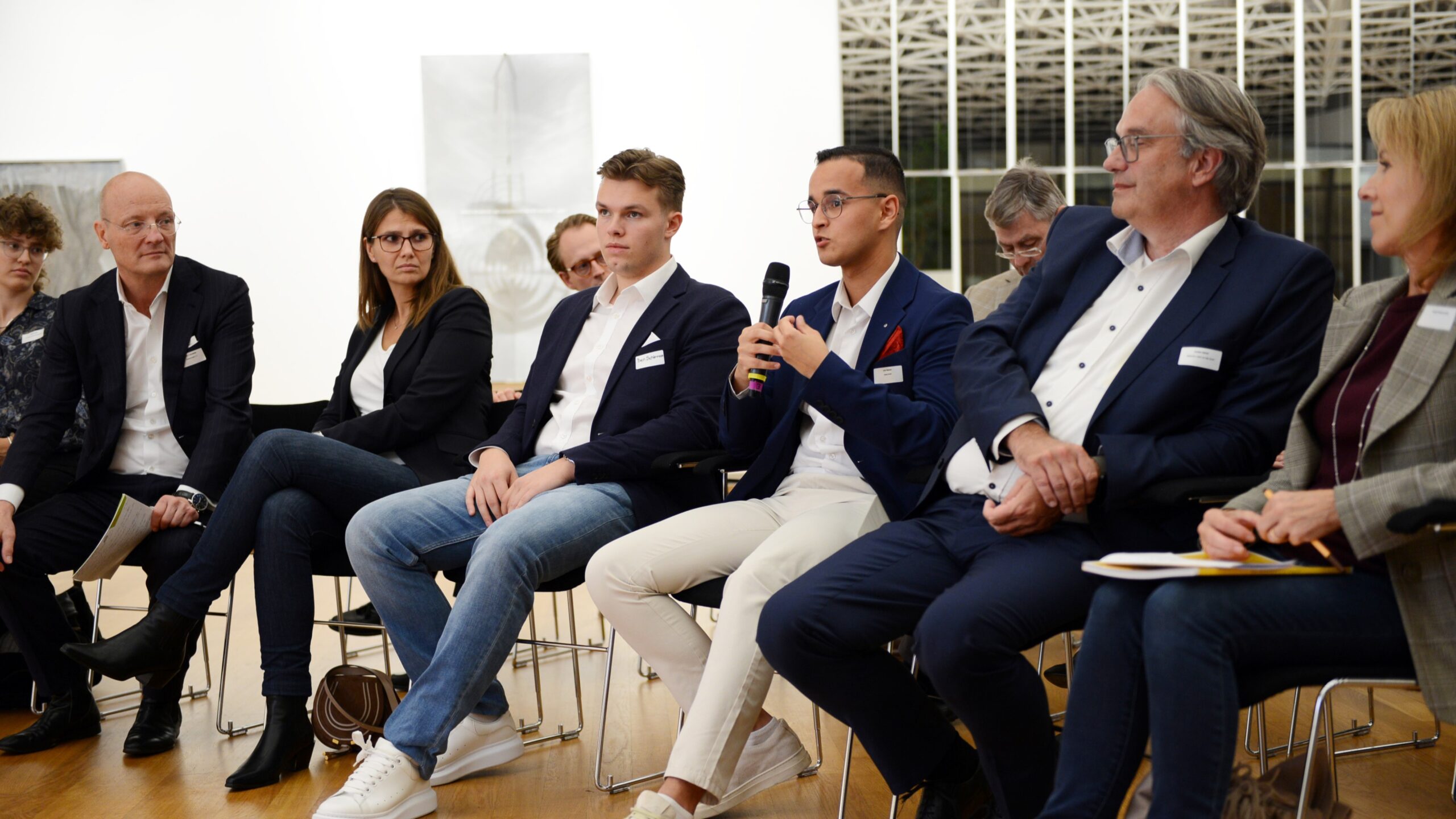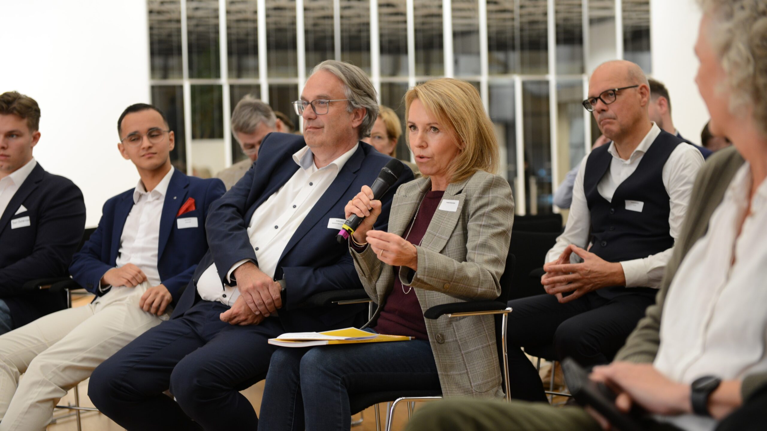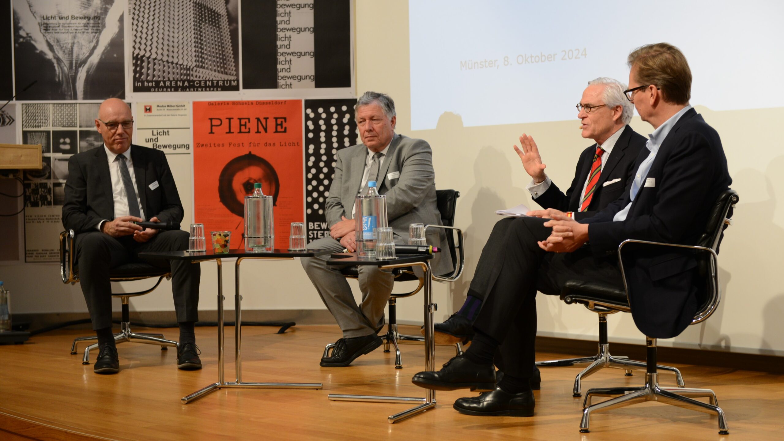 Nach der Begrüßung durch WestLotto-Geschäftsführerin Christiane Jansen (3. v. l.) diskutierten Prof. Dr. Harald Biermann (l.), Präsident der Stiftung Haus der Geschichte, Gerald Braunberger (2. v. l.), Herausg. FAZ, und Bastian Fassin (2. v. r.), CEO der Katjes Fassin GmbH & Co. KG, über die Frage „75 Jahre Grundgesetz – reichen Werte für den Zusammenhalt von Gesellschaften aus?“. Moderiert wurde das Gespräch von Dr. Philipp Busch (3. v. r.), Kuratoriumsvorsitzender der Werte Kommission.
