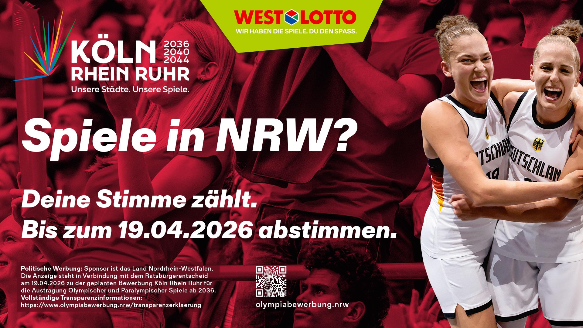Unter dem Motto „Deine Stimme zählt“ spielt WestLotto die Kampagne auf den digitalen Bildschirmen in den Annahmestellen aus und erreicht damit Millionen Menschen. In insgesamt 17 NRW-Kommunen können die Bewohnerinnen und Bewohner mit Ja oder Nein darüber abstimmen, ob sich ihre Kommune an der Bewerbung beteiligen soll. Ziel ist eine breite demokratische Legitimation für KölnRheinRuhr. Weitere nationale Kandidaten für eine Olympiabewerbung sind München, Hamburg und Berlin. Die Entscheidung, welchen Kandidaten Deutschland dann ins internationale Rennen um die Spiele 2026, 2040 oder 2044 schickt, fällt auf der Mitgliederversammlung des Deutschen Olympischen Sportbundes (DOSB) am 26. September.